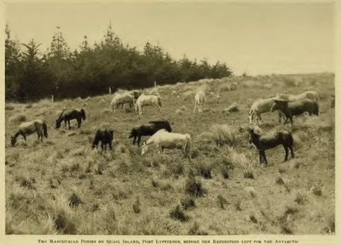 The ponies were enjoying their holiday on Quail Island and were becoming sleek and fat, and it was necessary that they should be broken to handling and sledge-hauling. Mr. C. Tubman undertook this work, with the assistance of Dr. Mackay, and there were some exciting moments on the island. The ponies were very wild, and more than once Mackay and Tubman had to make a rapid retreat from the animal they were schooling at the time. The white ponies, which later proved the most hardy, were the least tractable, and there was one white pony in particular that was left behind, because, though a splendid specimen physically, it could not be brought to a reasonable state of docility in the time at our disposal. I intended to take only ten ponies out of the fifteen, having allowed a margin for losses on the voyage to New Zealand, and Tubman and Mackay devoted their attention to the most promising animals. All the ponies had names, although I do not know from whom they received them, and we finally left New Zealand with "Socks", "Quan", "Grisi", "Chinaman", "Billy", "Zulu", "Doctor", "Sandy", "Nimrod", and "Mac".