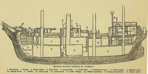 The final preparations involved an enormous amount of work, but by December 31 everything was ready, quarters were provided on the Nimrod for the scientific staff by enclosing a portion of the afterhold, and constructing cabins which were entered by a steep ladder from the deckhouse. The quarters were certainly small, in fact there was just room for the bunks and nothing else, and they were promptly named Oyster Alley, for some reason not on record. As the day of departure approached and the scientists brought their personal belongings, the alley reached a state of congestion that can hardly be imagined. The ponies were to be carried on deck, and ten stout stalls were built for them. The motor-car was enclosed in a large case and made fast with chains on the after-hatch from whence it could be transferred easily on to the ice when the occasion arose. The deck load was heavy and included cases of maize, tins of carbide for the manufacture of acetylene gas, a certain quantity of coal and the sledges. The Nimrod was low in the water as a result, and when we left Lyttelton the little ship had only three feet six inches of freeboard. Some live sheep presented to us by New Zealand farmers were placed on board the Koonya, the steamer which was to tow the Nimrod to the south.