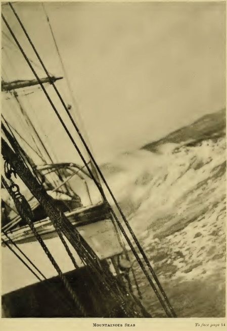 Bad weather was not long delayed. As the night of January 1 wore on, the wind began to freshen from the south-west, and the following morning the two vessel? were pitching somewhat heavily and steering wildly. The Koonya signalled us to veer, that is, to slack out thirty more fathoms on each of our two cables, and with great difficulty we managed to do this. The ship was pitching and rolling, flinging the cables from one side of the deck to the other, and with our forty-year-old windlass it was no light task to handle the heavy chains. Then I felt one of the first real pinches of the stringent economy that had to be practised from the inception of the expedition. How I wished for the splendid modern gear of the Discovery the large, specially built vessel that we had on the previous expedition. During the afternoon the wind and sea increased greatly, and the Nimrod pitched about, shifting everything that could be moved on deck. The seas began to break over her, and we were soon wet through, not to be properly dry again for the next fortnight. The decks were flooded with heavy seas, which poured, white-capped, over the side, and even the topsail yards were drenched with the spray of breaking waves. Lifelines were stretched along the deck, and it was a risky thing to go forward without holding on.
