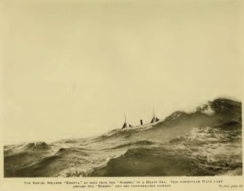 7. THE TOWING STEAMER "KOONYA", AS SEEN FROM THE NIMROD, IN A HEAVY SEA. THIS PARTICULAR WAVE CAME ABOARD THE NIMROD AND DID CONSIDERABLE DAMAGE