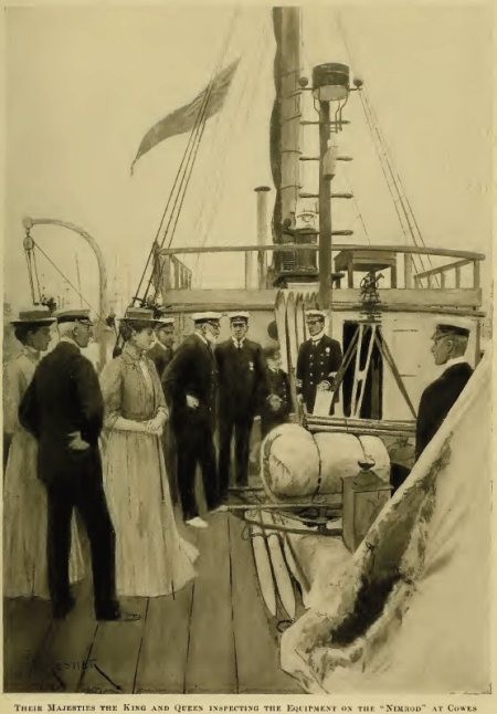 We anchored for the first night at Greenhithe, and on the morning of the 31st continued on our way to Torquay, landing Mr. Reid at Tilbury in order that he might return to London for letters. When he reached London that afternoon, he found at the office a telegram from the King's equerry, commanding the Nimrod to visit Cowes in order to enable their Majesties the King and Queen to come on board and inspect the ship and equipment on Sunday, August 4. Mr. Reid had considerable difficulty in delivering this message to me, but the Admiral Superintendent at Sheerness kindly despatched a tug which overtook the Nimrod off Ramsgate, and conveyed the news that an alteration in our plans was necessary. We sailed in the night for Cowes, and on the morning of August I stopped for an hour off Eastbourne in order to enable some of the supporters of the expedition to pay us a farewell visit. On the Sunday we were anchored at Cowes, and their Majesties the King and Queen, their Royal Highnesses the Prince of Wales, the Princess Victoria, Prince Edward and the Duke of Connaught came on board. The King graciously conferred upon me the Victorian Order, and the Queen entrusted me with a Union Jack, to carry on the southern sledge journey.