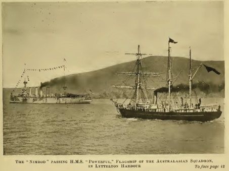 6. THE NIMROD PASSING H.M.S. "POWERFUL", FLAGSHIP OF THE AUSTRALASIAN SQUADRON, IN LYTTELTON HARBOUR