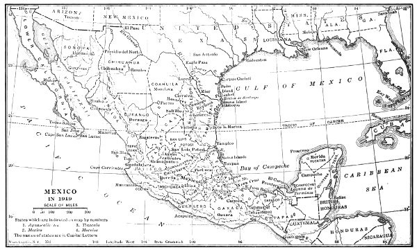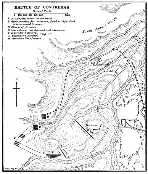 At about the time this order overtook him, the Huamantla affair occurred. From a military point of view he was now prostrate. He saw it himself, and knew that the country would see it. Evidently his countless political enemies would make the most of his complete failure, and he was doubtless aware that his military reports had offended many officers. His chief executive merits—decision and activity—had led only to a useless expenditure of life and money, it was now pointed out, and his ostensible patriotism was attributed to passion and obstinacy. Even his confidence in himself broke down. Unable to understand why failure had attended all his efforts, he fell into a sombre depression, and without a struggle he placed his troops at the orders of General Reyes, who joined him on October 11 with about 1000 men. His part in the war was over; and in the following January, realizing that nothing could be gained through intrigue or conspiracy and fearing the Americans would make him a prisoner, he asked for permission to leave the country. Both his own government and our authorities consented. And after giving a dinner at El Encero to the American officers of that vicinity, who had treated him with distinguished consideration, he sailed once more, about the first of April, from what he regarded as an ungrateful country.[21]