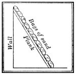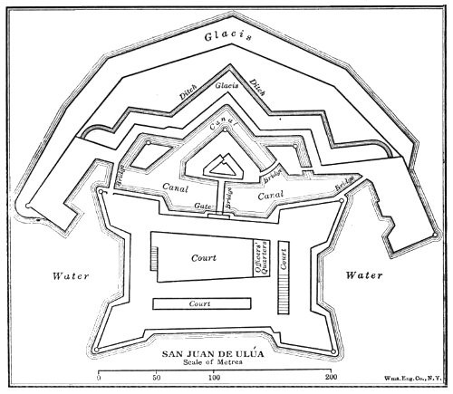 On September 23 and 24 unsuccessful attempts were made at Guadalupe, and the next day Santa Anna summoned Childs, describing his army as 8000 strong, and graciously announcing thatthe Americans might retirewith the honors of war. Childs replied as was proper, and then, riding to the posts, gave notice amid cheers that no surrender need be expected. To add the touch of humor that soldiers love, an American flag was manufactured out of an old Mexican uniform, and raised aloft; and the garrison settled down to severe duty, stern discipline, short rations and incessant watchfulness at all hours. The Mexicans tried to approach San José by throwing up successive breastworks at night in the streets leading that way, but shot, shell and rockets from Loreto kept them back. September 30 Santa Anna learned that no ammunition could be provided for the heavy cannon demanded of the minister, and resolved apparently to make a bold effort. With two 6-pounders he fired all day on the weak, plaza face of San José. But Childs, anticipating such a manoeuvre, had brought a 12-pounder from Loreto the night before; and this, protected with bags of tobacco, made an assault impracticable.[12]