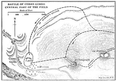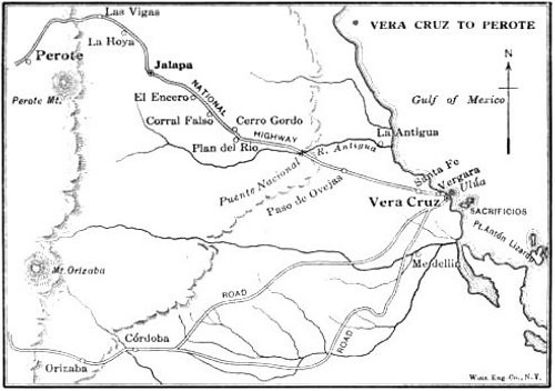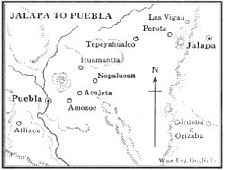 A new factor now entered the military situation. About the middle of September GeneralLane, one of Taylor’s chief officers at Buena Vista, arrived at Vera Cruz from the Rio Grande, and on the nineteenth his brigade set out for the interior. Aware of the situation at Puebla but not aware what was to be encountered on the route, the General had not made adequate preparations, and on meeting guerillas at the national bridge he was obliged to send back for ammunition and supplies. By October 1, however, he managed to leave Jalapa.[13]