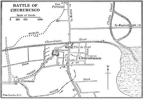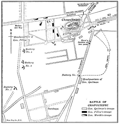 The final military operations of Scott seemed thus rather tame, as was natural; but Polk executed one that could be termed startling, if not exactly brilliant. His principal assistants were Pillow, Worth and Duncan; and in different ways each had excellent qualifications for the work. Pillow was not “The Lie Incarnate,” as Trist believed, nor even “a perfect ass,” as many thought; but vanity, ambition, lack of probity, and a gift for dark and cunning methods characterized him. His instincts and talents, indeed, were those of the criminal lawyer who minds nothing about his case except the verdict. When the President’s brother shot a man down in the street at Nashville, Pillow got him off. With reference to his work in helping bring about Polk’s nomination at Baltimore he wrote, “The fatal blow was given, but it was not seen nor known what produced such a result—nor where the blow came from.” “I feel as boyant as the air,” he said in December, 1846, when great dissatisfaction with Taylor prevailed at Washington, because I know “that I have done the work.... I have paid him in full” for his treatment of me. And one could seldom get a finger on Pillow’s back, when he was not wriggling actively toward some object of selfish desire.[26]