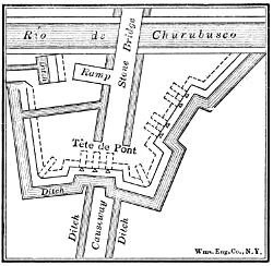 Headquarters, Lieutenant Colonel Black of Pennsylvania and the main body of troops occupied thea large rectangular building on the eastern side of the town, which had a plaza of its own opening toward a public promenade called the Tivoli. To this position five howitzers were allotted, and within a hundred and fifty yards of it all the sick were placed. Half a mile or so from the town on a hill stood Loreto fort, a stone affair equipped with two 12-pound field guns and a 10-inch mortar, where Major Gwynn of the Sixth Infantry commanded; and not far distant, on a higher point of the same hill, was Guadalupe church, now protected with mountain howitzers, a ditch and an earthen wall, under Captain Morehead of the Pennsylvania regiment. But the chief element of the defence was the large, robust, finely-featured Childs, a skilful and veteran officer, cold in manner, clear in judgment, and inflexible in courage. September 13 thebegan in earnest, and from that day on there was a continual small-arm attack, particularly at night, upon San José, which replied with a musket and howitzer fire that kept the assailants at a respectful distance. What was more serious than guerilla shooting, all supplies were now cut off. Such was the state of things at the second city of Mexico when Santa Anna retired from the first.[11]