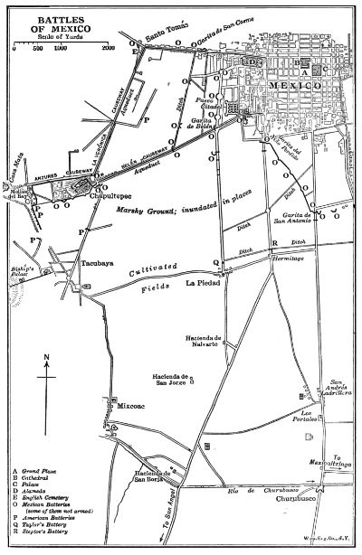 The result was a powerful movement against the prestige and authority properly belonging to Scott. Pillow’s reports on the battles of Contreras and Chapultepec tended to represent the General as a nonentity; and Worth not only did somewhat the same, but referred to the Commander in terms of ridicule and contempt. A letter, doubtless written directly or indirectly by Pillow over the signature of “Leonidas,” extolling Pillow shamelessly and belittling Scott, was trickily worked into the New Orleans Delta of September 10, 1847; and another letter, containing a passage intended to show that Worth and Duncan had saved Scott from choosing the wrong approach to the capital, appeared in the United States, then in a Tampico newspaper and finally at Mexico City. Both letters were grossly improper, especially since the army lay in the enemy’s country; and Scott found it necessary to act. As he well said, “The general-in-chief who once submits to an outrage from a junior, must lay his account to suffer the like from all the vicious under him,” and “even the great mass of the spirited, intelligent, and well affected, among his brothers in arms, would soon reduce such commander to utter imbecility, by holding him in just scorn and contempt” for his recreancy to himself and the country.[30]