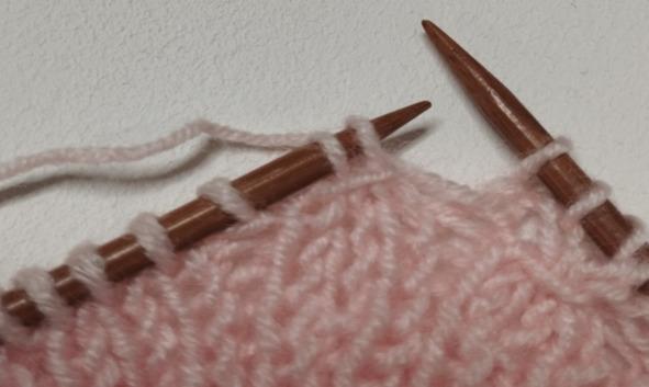 Затем из петель этой цепочки на круговые спицы №4 набираем 61 петлю пряжей белого цвета, затем вяжем 2 ряда лицевой гладью: