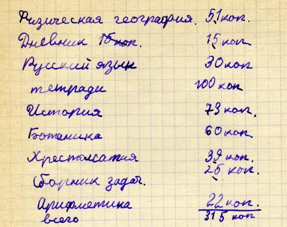 Чего стоили новые веяния нашим родителям? Дополнительно к школьной форме, портфелям, трико и кедам — затрат на те самые новые учебники, которые ранее можно было просто позаимствовать у отучившихся старших товарищей. Практики «проката» учебников из школьной библиотеки, напомню, в те годы не существовало, так что покупка их становилась частью нормального ритуала подготовки к каждому новому учебному году. О том, сколько всё это стоило в действительности, свидетельствует обнаруженная в архиве «смета», написанная моим детским почерком. Набор учебников для пятого класса (плюс 50 двухкопеечных тетрадок), если верить точности подсчёта, обошёлся семейному бюджету (родители на двоих получали в месяц около 300 рублей) в 3 рубля 15 копеек.