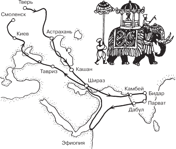 А документ в самом деле прелюбопытный. Вот что из него следует. Когда в 1466 году великий князь Московский Иван III отправил своего посла Василия Папина ко двору шаха страны Ширван, купец из Твери Афанасий Никитин, собиравшийся в торговую поездку на Восток, решил присоединиться к этому посольству. Готовился он основательно: достал проезжие грамоты от великого князя Московского и от князя Тверского, охранные грамоты от епископа Геннадия и воеводы Бориса Захарьевича, запасся рекомендательными письмами к нижегородскому наместнику и таможенному начальству.