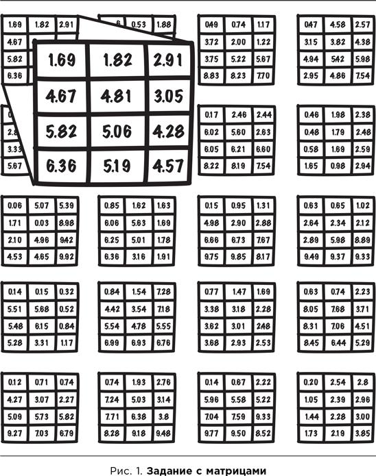 Я и мои коллеги Нина Мазар (преподаватель в Торонтском университете) и Он Амир (преподаватель Калифорнийского университета в Сан-Диего) решили глубже изучить процесс мошенничества. Мы развесили объявления по всей территории Массачусетского технологического института (MIT), где я в то время преподавал, в которых предлагали студентам заработать: до 10 долларов примерно за 10 минут [4]. В назначенное время желающие вошли в комнату и сели в кресла, к которым были прикреплены небольшие столики (обычная обстановка во время экзаменов). Затем каждый участник получил лист бумаги с 20 матрицами (похожими на матрицу, изображенную на рис. 1). В каждой из этих матриц нужно было найти пару чисел, составляющих в сумме 10 (такую задачу мы называем матричной и часто будем возвращаться к ней в этой книге). Участникам сообщили, что у них есть пять минут на то, чтобы найти решение для максимального количества матриц, и что за каждый правильный ответ они смогут получить по 50 центов (в разных экспериментах сумма варьировалась).