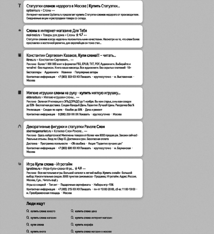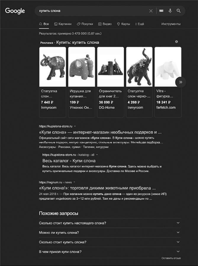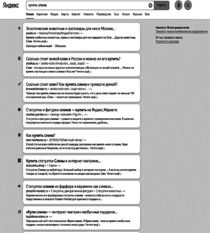 Поисковый запрос – слово или словосочетание, которые пользователь вводит в поисковой строке поисковой системы. На рис. 6 поисковый запрос пользователя – «купить слона».