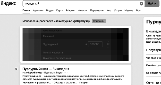 Колдунщик – модуль, который отображается поисковой системой, чтобы пользователь мог решить свою задачу или получить ответ на запрос сразу в поисковой выдаче, не переходя на сторонние сайты. Так, на рис. 8 показан колдунщик «Яндекса» для работы с цветом.