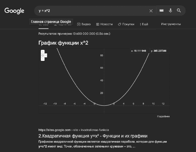Конечно, в Google тоже есть колдунщики. Например, если ввести в строке поиска «y = x^2», система сразу визуализирует график функции (рис. 9). И у «Яндекса», и у Google масса вариантов колдунщиков. Некоторые из них есть в каждом поисковике, скажем курс валют или калькулятор, а некоторые только в одном, как цветовой подсказчик в «Яндексе».