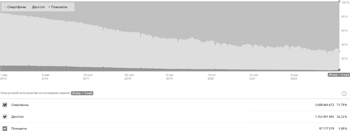 По данным аналитического сервиса «Яндекс. Радар», в России трафик распределяется по трем типам устройств: смартфоны, десктопы (настольные компьютеры) и планшеты. На долю пользователей мобильных устройств приходится 71,79 % всего трафика (рис. 1).