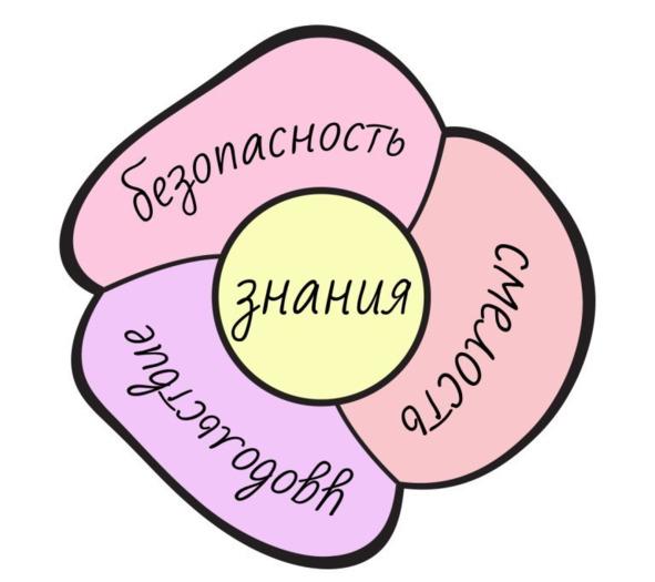 Резюме. Эти три естественные причины, по которым мы учимся, звучат просто и загадкой ни для кого не являются. Но если спросить школьника, зачем он учиться, вряд ли он объяснит, зачем ему все эти предметы в том формате, в котором их преподают в школе. И об этом мы тоже поговорим, но чуть позже. А пока сделаю вывод в виде небольшой схемы. Схема из себя представляет распускающийся цветок, в центре которого знания, а первые лепестки — это безопасность (защищенность), смелость (уверенность) и удовольствие (счастье).