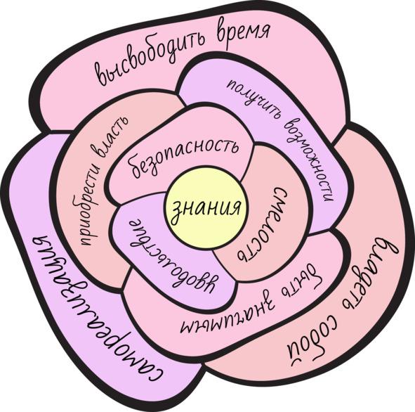 Вы можете дополнить эту схему своими лепестками, в виде заработка, который будет ответвлением безопасности, успеха (счастье, удовольствие), самосовершенствования (безопасность, смелость, удовольствие) или любых других ваших целей.