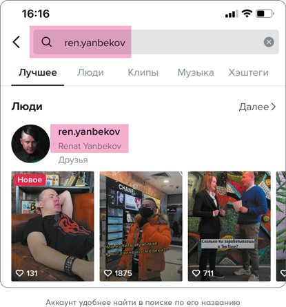 Для поиска тиктокеров, которых я упоминал в книге, QR-код вам не понадобится. В скобках рядом с их именами я указываю названия аккаунтов. Сканировать в этом случае ничего не нужно — удобнее набрать название аккаунта в поиске приложения TikTok: