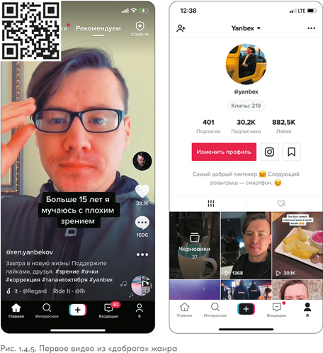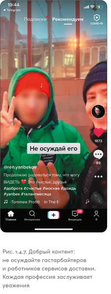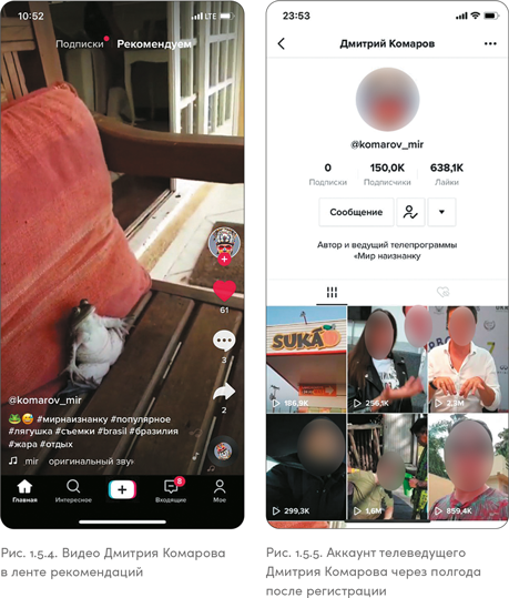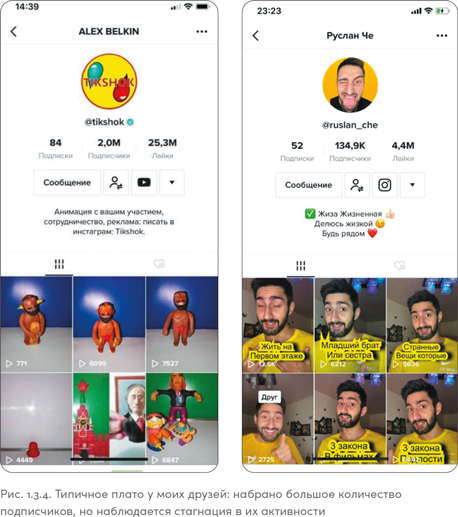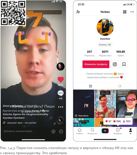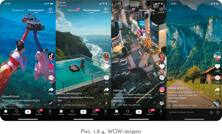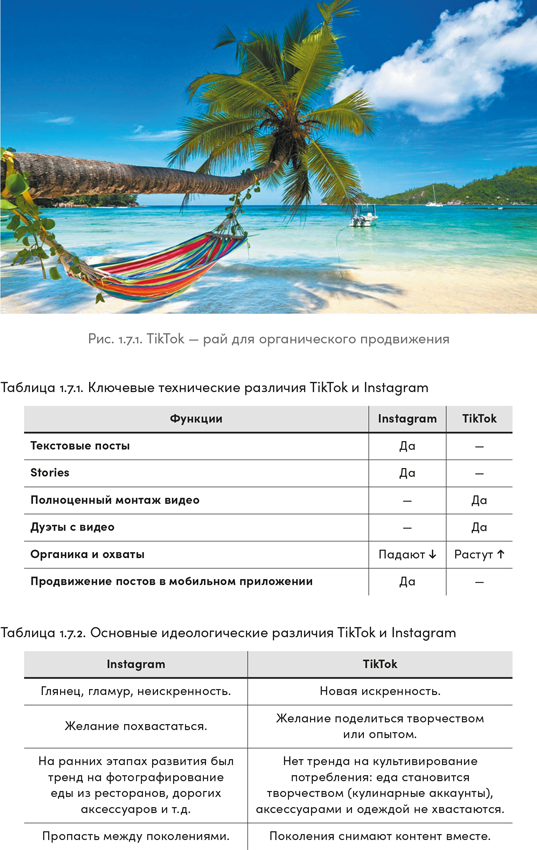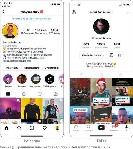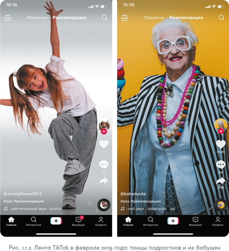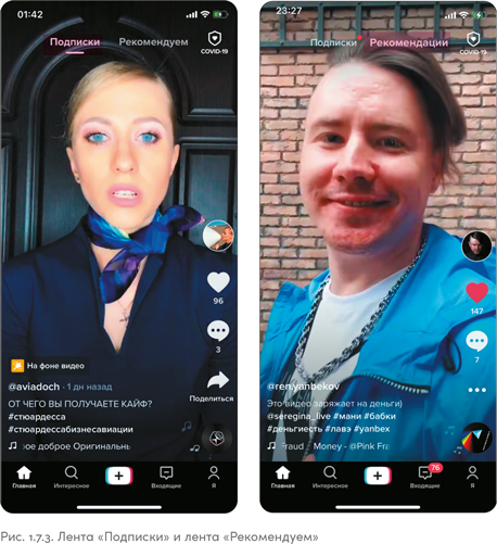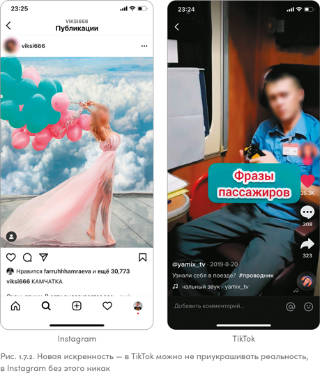 Посмотрев на рис. 1.7.2, вы без труда отличите, какое изображение из Instagram, а какое из TikTok. Парень на скриншоте справа работает обычным проводником поезда и показывает рабочие будни без прикрас, со всеми неудобными моментами. В TikTok он стал популярным быстро, сделать это в Instagram ему было бы намного тяжелее.