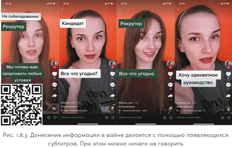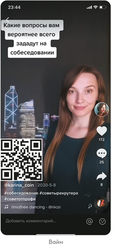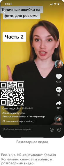 Девушку на рис. 1.8.2 зовут Карина Копейкина (@karina_coin). Карина — HR-консультант, в TikTok она делится секретами успешного трудоустройства. В своем аккаунте она использует оба вида: и вайны, и разговорные видео. Такой смешанный подход к контенту в TikTok часто встречается и у экспертов, и у брендов.