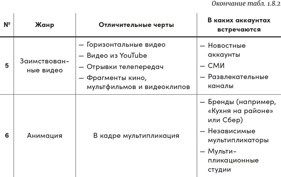 В таблице 1.8.2 приведены наиболее популярные жанры видео, которыми, однако, всё их разнообразие не ограничивается.