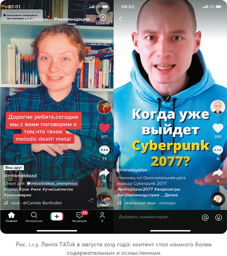 Как правильно заметил Дмитрий Румянцев, мой коллега и известный эксперт по SMM, «TikTok — это платформа, которая сконцентрировалась на одной функции». В одном из постов на своей странице «ВКонтакте» он пишет: «Перед нами новое поколение соцсетей, которое опирается только на быстрый видеоконтент. TikTok, по сути, сделал функцию Stories центральной. Дикая популярность этого формата просто не могла пройти незамеченной»2.