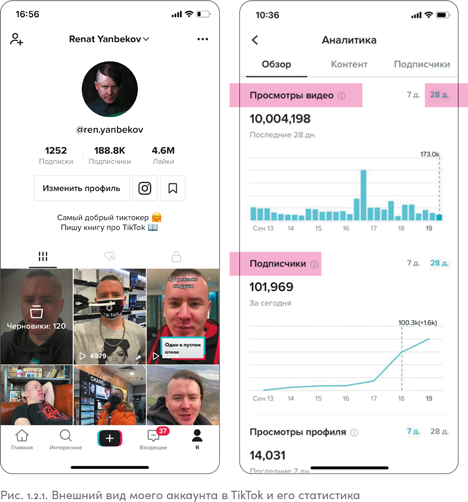 На рис. 1.2.1 вы можете оценить внешний вид моего профиля в TikTok, а справа — статистику за 28 дней апреля 2020 года: за эти четыре недели я получил 10 млн просмотров видео и 14 000 посещений моего профиля, хотя не являюсь суперзвездой. Всё это стало возможным благодаря самой площадке.