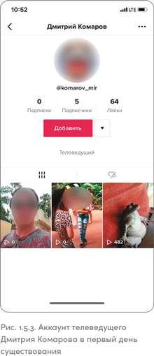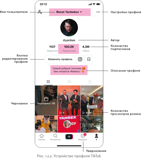 Профиль пользователя TikTok немного похож на профиль в Instagram: в нем тоже есть аватар, описание профиля с указанием количества подписчиков и лента постов пользователя (рис. 1.2.2).