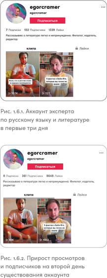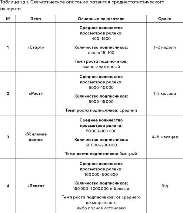 Конечно, таблица 1.3.1 носит условный характер — цифры и сроки могут варьироваться. Но общие этапы продвижения, указанные в ней, характерны для любого аккаунта и справедливы не только для TikTok. Давайте разберем их подробнее.