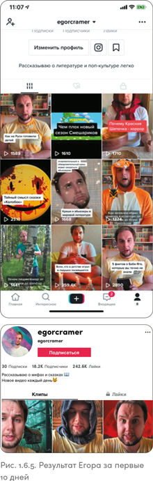 На момент издания книги у Егора 104 200 подписчиков и почти 1 млн лайков. Всё, что ему остается делать, — это продолжать снимать новые видео.