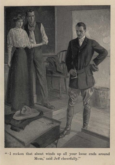 Jeff smiled to himself a little uneasily. What would Mesa City be saying about the unexplained arrival of a captivating female from New York who sought him out at his office and whose claims upon his society (unless he fled) could not be denied. There was no chance for him to flee, even if he wished, the condition of his business requiring his presence here for at least a few days, and the trunk check in his hand reminded him that he had promised Rita Cheyne her trunk immediately, so that she might ride with him that very afternoon. What was to be done? Her ingenuity had always surprised him, and her resources were of infinite variety. To tell the truth, he was afraid of her, and was willing for the first time to acknowledge it frankly to himself. She interested him—had always interested him—but it seemed to be more the interest of curiosity than that of any real affiliation. To be with Rita Cheyne was like going to a three-ring circus, where one is apt to lose sight of the refined performance on the stage just in front in bewilderment over the acrobatic feats of the lady in spangles at one side. What was her real reason for coming West to Mesa City? He gave it up and turned in at the office, gave the trunk check to a clerk, and in a moment had taken up his business at the point where Mrs. Cheyne had interrupted him.