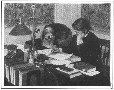MARGARET DELAND WRITING IN HER LIBRARY.