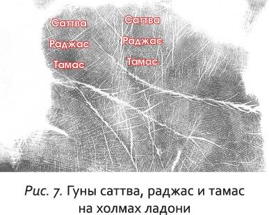 Стоит пояснить, что понятие трех гун получает различное толкование в зависимости от того, к какой школе индийской философской мысли мы обратимся. К хиромантии наиболее применима точка зрения на гуны в философии санкхья, согласно которой функция саттвы — проявление, раджаса — действие, а тамаса — сдержанность (сопротивление или бездействие).
