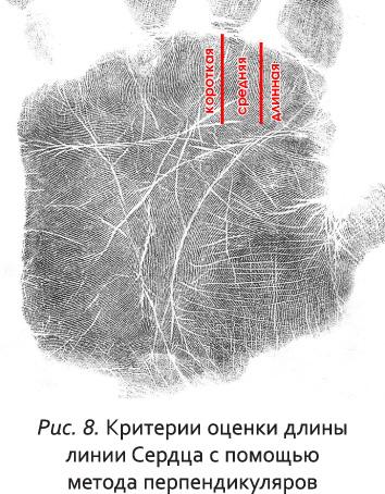 Для оценки того, является ли линия Сердца короткой или длинной, можно использовать метод перпендикуляров, опущенных строго вниз из середины среднего и из области между средним и указательным пальцами. Полноценный холм Юпитера начинается лишь за второй вертикалью.