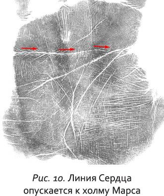 Линия Сердца идет к холму Марса — по смыслу эта конфигурация похожа на линию Симиан: в человеке усиливается контроль над внешним проявлением чувств и эмоций, но при этом присутствуют собственнические тенденции и ревность. В старых книгах — признак «психопата», но в реальности этот знак встречается у вполне уравновешенных, хоть и ревнивых людей (исключение — короткая линия Головы и короткие пальцы, усиливающие импульсивность).