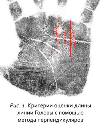 Каковы же критерии длины линии Головы? В каких случаях она признается короткой, а в каких — длинной? Как ни странно, четкий ответ на этот вопрос вы вряд ли встретите в книгах по хиромантии. Предложим свой вариант: чтобы определить, к какому типу относится линия Ума, проводим перпендикуляры из середины безымянного пальца и из области между безымянным и мизинцем строго вниз. Если линия достигает второго перпендикуляра, она признается длинной. Если не достигает первого — короткой. Все, что между, — это средняя, статистически самая частая длина линии Головы.