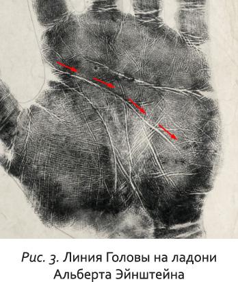 Примером такой конфигурации является линия Головы на ладони Альберта Эйнштейна. Здесь мы имеем «золотую середину»: обладая фантазией, человек все же не витает в облаках или не уходит в мистическое ви́дение, а сохраняет сильную связь с реальностью и фактами. Чем сильнее изгиб линии Головы, тем креативнее мышление обладателя руки, сильнее фантазия и тем больше человек склонен отступать от правил строгой логики.