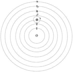 Геоцентрическая система Аристотеля и Птолемея. 1. Земля. 2. Меркурий. 3. Солнце. 4. Юпитер. 5. Сфера неподвижных звезд. 6. Луна. 7. Венера. 8. Марс. 9. Сатурн. Классическая геоцентрическая система пифагорейцев; сферы двигаются против часовой стрелки