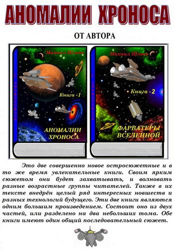 Эта книга о трёх изобретателях. Настойчиво добиваясь своего, наши герои построили реальную машину времени. Как это событие изменило их жизнь, как они нашли себе в будущем благородную, но очень опасную работу. Выполняя свои обязанности, спасая на обречённых планетах целые цивилизации от ужасных катастроф, наши герои стойко боролись с разгулявшимся в те времена космическим братством пиратов. Ломая их планы, они уверенно двигались к своим целям. Преодолевая барьеры времени, совершали опасные экспедиции в далёкие созвездия неизведанных галактик. «Аномалии Хроноса» книга — 1 и «Фарватеры вселенной» книга — 2 — это две составные части одной большой увлекательной книги.