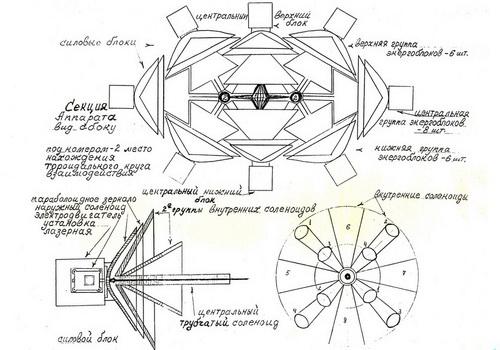 Александр высказываясь, меня поддержал: «Многие очевидцы НЛО утверждают, перед тем, как взлететь тарелки раскручиваются, передвигаясь в воздухе, ярко светятся даже днём. А ещё могут резко менять направление и вообще мгновенно скрыться. Все эти факторы в нашем аппарате как бы присутствуют. Я думаю, более того, я полностью уверен, что у нас всё получится». «Немаловажный вопрос я хочу осветить, — начала сразу Ксения. — Человеческий организм подвержен воздействию сильных внешних электромагнитных полей, которые могут нанести ему большой вред и даже убить его. Поэтому человеку необходима защита. Такой защитой может являться непосредственно капсула пилотов эллипсной формы. Изготовлена она из сплава алюминия и покрыта вся редкоземельными элементами с поверхностной обработкой высокого класса частоты. Второй же активной защитой кабины у нас будет отражающее, направленное зеркало, со своими наружным и многими внутренними соленоидами. Это верхнее самое большое зеркало аппарата». Обсудив всё это, выбрав пути реализации заключительной части построения и испытания нашего подопечного, мы поздно вечером разошлись по домам.