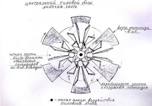 Далее я хотел рассмотреть строение силового блока, пользуясь моими чертежами. «Он имеет форму кругло-вогнутого диска или скорее зонтика, — продолжал я упорно доказывать своё. — Все соленоиды внутри этого «зонтика» под разными углами равномерно размещены по кругу. В центре установим трубчатый соленоид сопровождения газа, а в будущем плазмы. Я хотел вернуться к нашему вогнутому диску, то есть основанию силового блока. Состоит он из вогнутого металлического зеркала, с отверстием в середине, обнимая весь конус соленоидов. За зеркалом с наружи расположен кольцевой соленоид с лазерной установкой».