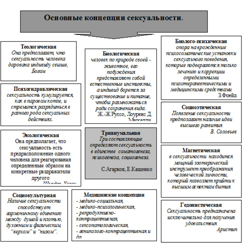 Мировое сообщество выработало ряд концепций, отражающих систему взглядов на сексуальную активность: теологическая, биологическая, биолого-психическая, социоэтническая, гедонистическая, психогидравлическая, магнетическая, медицинская, социокультурная и тривиумальная. Последний из перечисленных подходов является наиболее оптимальным для комплексного понимания проблем социогенеза сексуаьности.