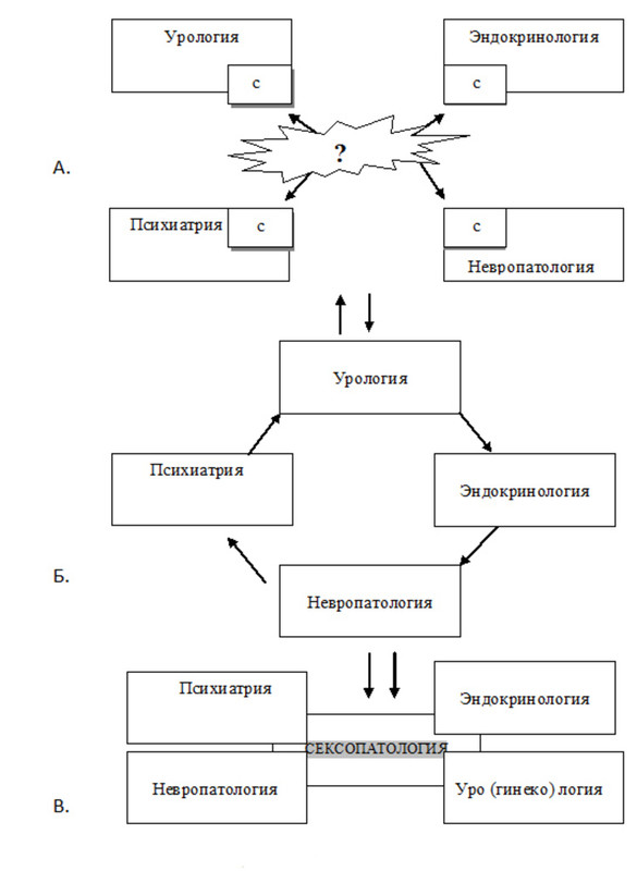 Аналогичным образом строилась логика психиатра: есть большая психиатрия, то есть диагностика и лечение психозов. Есть малая, пограничная психиатрия, занимающаяся лечением неврозов и личностных расстройств. Все сексуальные проблемы составляют малую часть неврозов и расстройств личности, поэтому компетенции психиатра вполне достаточно, чтобы легко справиться с ними. Таким же образом врач- эндокринолог связывал сексуальные расстройства у мужчин с осложнением сахарного диабета, а врач-невропатолог с поражением церебральных и спинальных сексуальных центров. Недостатком этой концепции был поиск одной причины расстройства и всегда в зоне своей узкой компетенции, а преимуществом — наличие одного врача, отвечающего за процесс лечения и его эффективность.