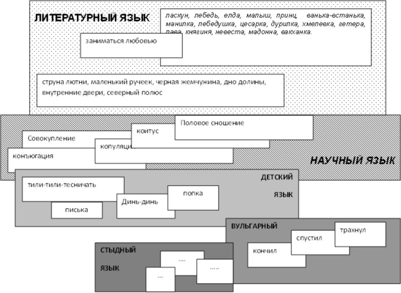 Ю. П. Прокопенко в конце прошлого века собрал некоторые известные синонимы из сексуальной лексики, свойственные российской сексуальной культуре. Если расставить эти термины по предлагаемым выше уровням, то получится следующая картина: