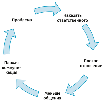 А когда проблему никто не решает, то она начинает увеличиваться и достигает такого масштаба, что становится заметна большому начальнику. А у любого руководителя в подобных случаях есть универсальное решение — назначить кого-то ответственным. Оказавшийся крайним сотрудник будет считать себя несправедливо пострадавшим по милости коллег из другого отдела. Как следствие, отношения между сотрудниками подразделений ухудшаются, они начинают реже общаться, и ситуация усугубляется: образуется замкнутый круг, изображённый на рисунке ниже.