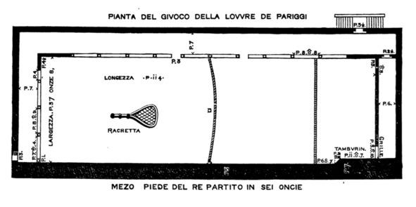 Из отрывка (стр. 161), в котором он говорит, что этот корт будет служить примером большого теннисного корта, «по милости самого доблестного и христианского короля Генриха, построенного с большой архитектурной красотой», следует, что он построен Генрихом, а не его отцом, как сообщали нам другие источники. Он дает нам здесь план очень большого корта, существовавшего в 1555 году и почти идентичного теннисным кортам наших дней, за исключением его большего размера и одной или двух меньших отличий. Эти последние сразу бросаются в глаза теннисисту, а именно отсутствие короткой стены между деданcами (dedans) и главной стеной и дополнительное отверстие, или hazard, в стене на другом конце корта. На месте современной сетки показана висящая поперек середины корта веревка (corde), параллельно ей начерчена segno principale, эквивалентная современной линии подачи (service-line). В дедансах есть четыре поста, расположенные на разных расстояниях друг от друга, и двери между первой и второй галереями действительно являются дверями, так как веревки там нет; но, с другой стороны, с каждой стороны есть галерея — большая, чем в настоящее время. Французский фут, состоящий из 12 дюймов, как уже говорилось[61], был примерно на три четверти дюйма длиннее английского; и этот старый корт, вероятно, был 114 французских футов в длину, в то время как современные корты имеют длину только от 93 до 96 английских футов. Скаино описывает его как «грандиозного размера, как и подобает величию короля; четырехярусный (fascie) в высоту и обнесенный большой стеной; поэтому игра становится свободной, великолепной и королевской, от широкого пространства двора, но не слишком длинной или большой для хорошей игры. Он окружен прекраснейшим портиком, который французы называют галереей, очень удобным как для собрания многих вельмож, желающих присутствовать при столь благородном и королевском сражении, так и для проведения [по ней] мяча [во время игры]», подачи, и т. п.