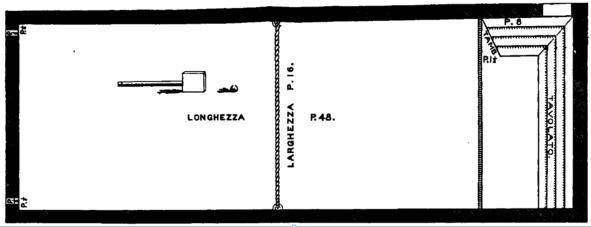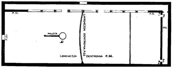 На третьем плане (рис. 5) изображен тесный корт для игры рукой, но удобен также для палеты или паллеции (palletia), на конце capo находился брус из досок высотой 3 фута и на расстоянии 3 футов от двери в боковой стене, через которую входили на корт; длиной 8 футов параллельно плоскости корта; в конце к нему была прикреплена другая доска с наклоном 1½ фута, встречающаяся со стеной справа. Она располагалась на высоте 8 футов от пола; а на ее стыке появилось покрытие, служившее tavolato (или пентхаусом), простиравшееся до стены и вдоль всей стены capo del giuoco, чтобы мяч мог скатиться с нее. Это создавало ограждение вокруг двери и имитацию тамбура, а также галерею, которая могла вместить многих зрителей. Та часть парапета, которая соединялась со стеной, могла открываться и закрываться, давая доступ к игровой площадке.