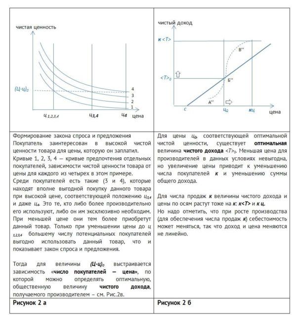 На Рисунке 2а отмечена горизонтальная прямая (Ц-ц) 0. Она показывает, что формируется некая оптимальная (общественная) чистая ценность, которая удовлетворяет и покупателей, и производителей, получающих оптимальный чистый доход <T> 0 — см. Рисунок 2б, который при соответствующей цене ц0 удовлетворяет производителей, готовых тогда изготовить нужное количество товара. Таким образом, конкретный товар, имеющий для разных людей разную ценность (может быть, даже разную эстетическую ценность, которая принципиально неисчислима), приобретает вполне объективное значение оптимальной чистой ценности. Оно характеризует уже не предпочтения персональные, а предпочтение общественное.