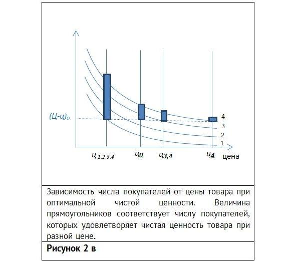 Отсчет числа потенциальных покупателей (см. Рисунок 2в) идет именно от величины оптимальной чистой ценности, и именно относительно оптимальной чистой ценности происходят колебания цены и, соответственно, числа покупателей конкретного товара. Таким образом, закон спроса — предложения формирует оптимальную чистую ценность товара, его общественную цену. Далее под чистой ценностью будет пониматься именно оптимальная чистая ценность. Конечно, прямой зависимости «меньше цена — больше покупателей» не бывает. Это демонстрирует график 2б. Так, на цену влияет и распределение покупательной способности в обществе. В некоторых развивающихся странах товары, массовые в развитых, являются элитными, штучными и только высшие слои местного общества могут платить за них несоизмеримо большие для данной страны деньги[5].